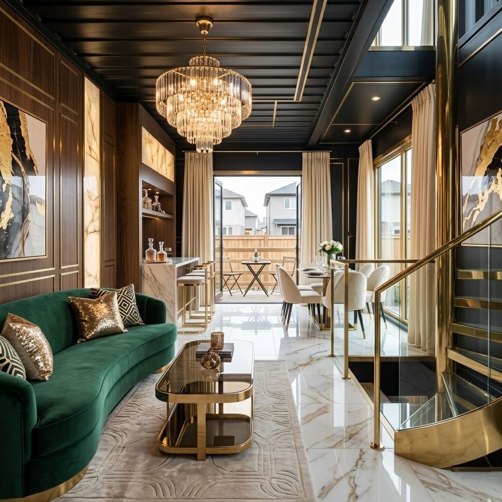 - Strefa Dzienna: Z głęboką, szmaragdową aksamitną sofą, złotym stolikiem kawowym i designerskim dywanem.